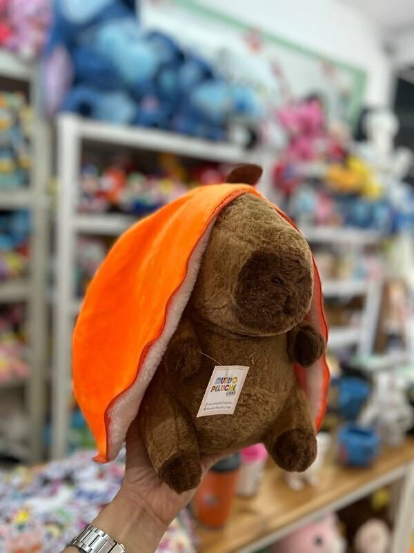 El peluche en forma de Naranja contiene un cierre a su alrededor, abrilo y encontrarás al peluche de CAPYBARA dentro. Para cerrarlo deberás colocar el capybara nuevamente dentro de las solapas de la naranja y cerrar el cierre.